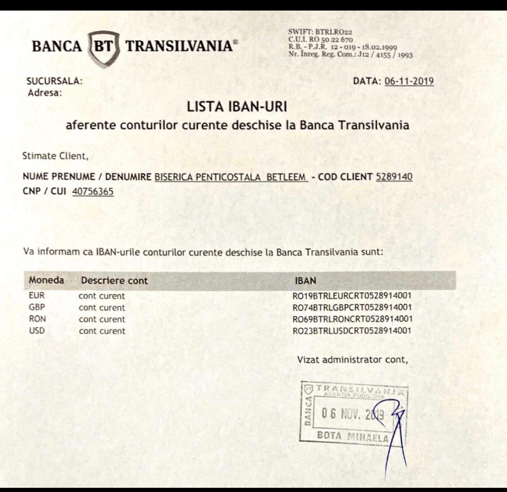 Vom atașa câteva poze și conturile Bisericii noastre pentru cei care doriți să faceți donații.!Cu specificația SINISTRAȚI ROȘIA MONTANĂ! Vă asigurăm de maximă transparență și credincioșie în gestionarea bunurilor adunate. Am improvizat un depozit temporar pe strada Poetului, Arad, în clădirea Bisericii vechi Baptiste (lângă cortul Bisericii Betleem) Nr. 72, în fiecare seară la orele 19:00 vor fi oameni care vor prelua alimentele și donațiile dumneavoastră.