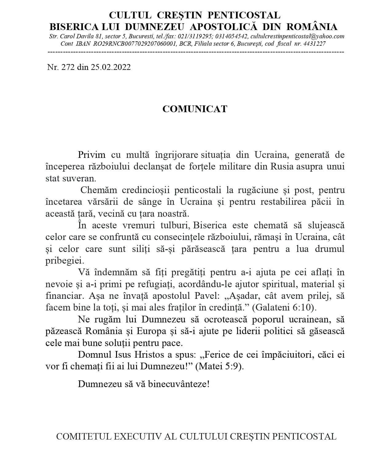 Comunicatul Cultului Penticostal din România privind criza din Ucraina Publicat pe februarie 25, 2022 de onisimbotezatu Partajează asta: Dă clic pentru a partaja pe X(Se deschide într-o fereastră nouă) X Dă clic pentru a partaja pe Facebook(Se deschide într-o fereastră nouă) Facebook Apreciază Încarc... Similare