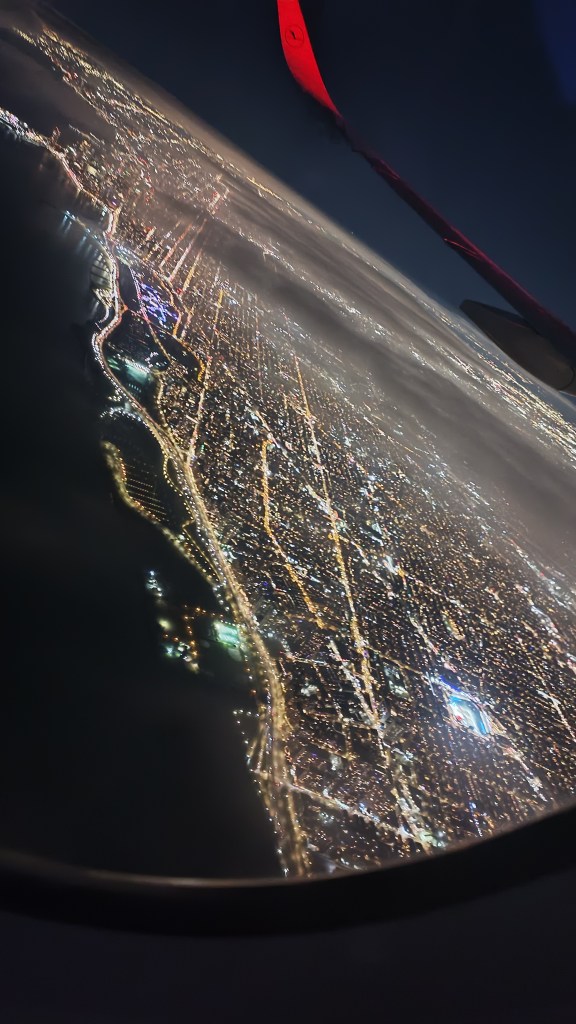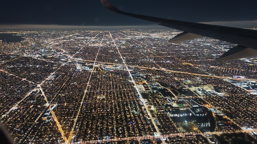 Impresionant. Chicago se prezintă de la înălțime ca o mare de lumină. Lacul Michingen, pare el însuși uscatul și întinderea de lumini mare solară. Și nu exagerez. După 8 ore de întuneric și pustie peste Oceanul Atlantic, apare ca o oază a speranței această imensitate de lumină. Pe măsură ce te apropii, realizezi inteligența umană și inginerească apropiată de desăvârșire arhitecturală.