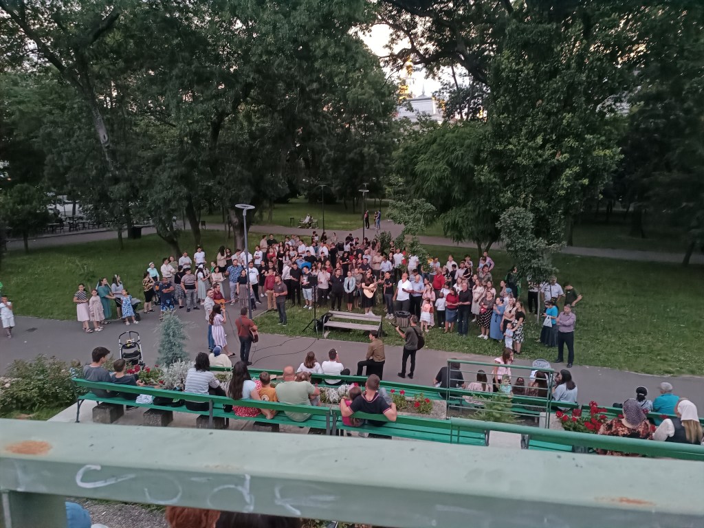 Biserica Betleem, împreună cu tineri de la încă patru biserici din Arad slujim în stradă! Mame cu copii în brațe și cărucioare după ele, tați cu puiuții după gât, băieți și fete cu chitările în mână, conectați la o boxă mobilă. Cu mic cu mare am luat cu asalt parcul Eminescu din Arad. Un flux foarte mare de oameni. La fiecare 10 minute minim 100 de oameni care trec și ascultă cântece și mici intervenții de prezentare a Cuvântului vieții.