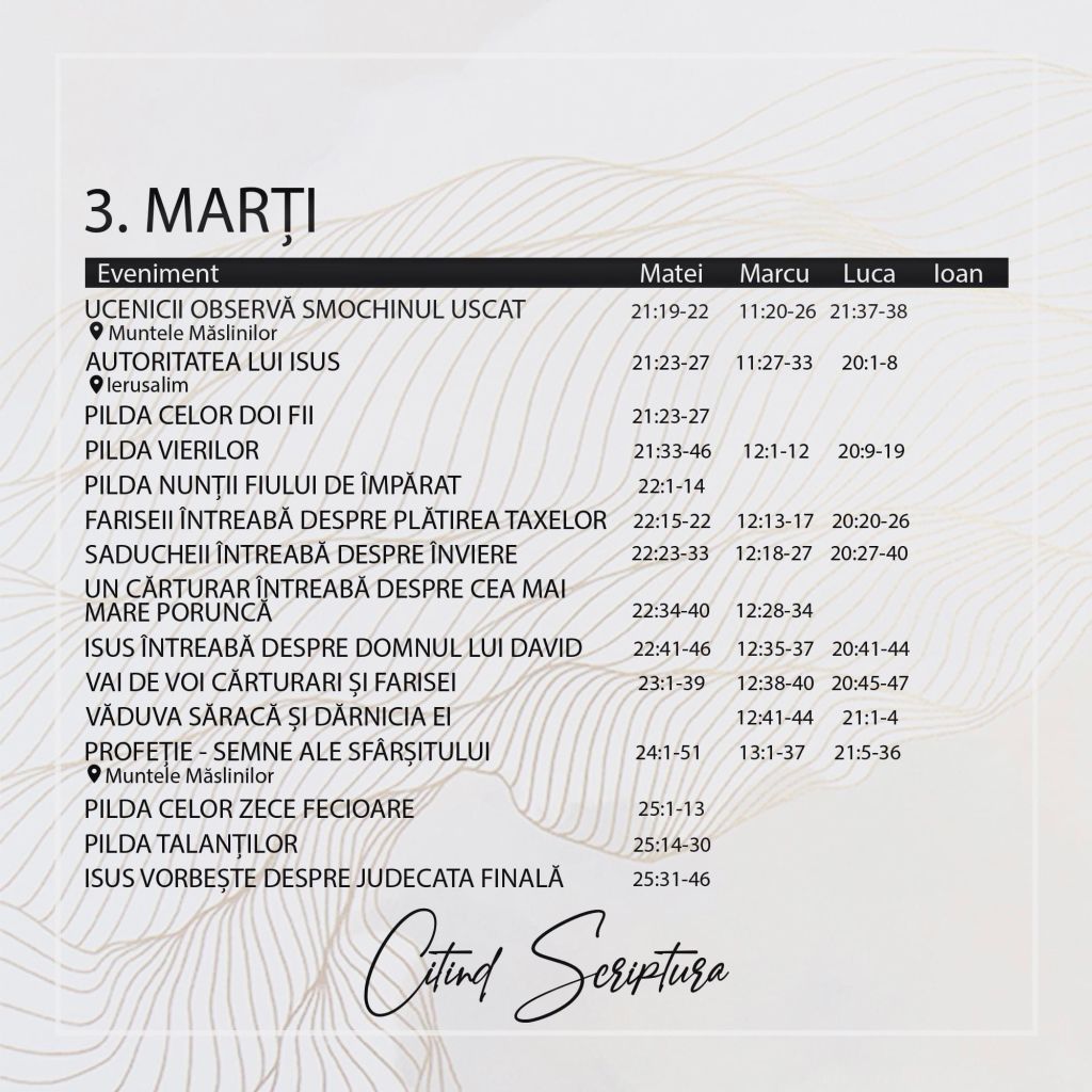 Dumnezeu vorbește o dată, de două ori, uneori de o mie de ori, apoi tăcere. Când el tace mori cu zile. Martin Luther spunea: „Doamne, ceartă-mă! Mustră-mă! Numai spune ceva în dreptul meu că tăcerea ta mă usucă de pe picioare! Mă omoară!” Cel mai aprig blestem pentru un om este să nu îi mai vorbească nimic Dumnezeu. Vorbise 3600 de ani de istorie. Apoi tace 400 de ani. Apoi iar vorbește prin Hristos 33 de ani. Apoi iar tace o zi și se blochează universul. Se stinge soarele ziua ‘namiaza mare. De atunci a lucrat două zile(sau 2000 de ani). Tocmai am intrat în zorii celei de a treia zi. Sunt pregătiri intense de nuntă în cer. Stați gata, dar. Se apropie Mirele!