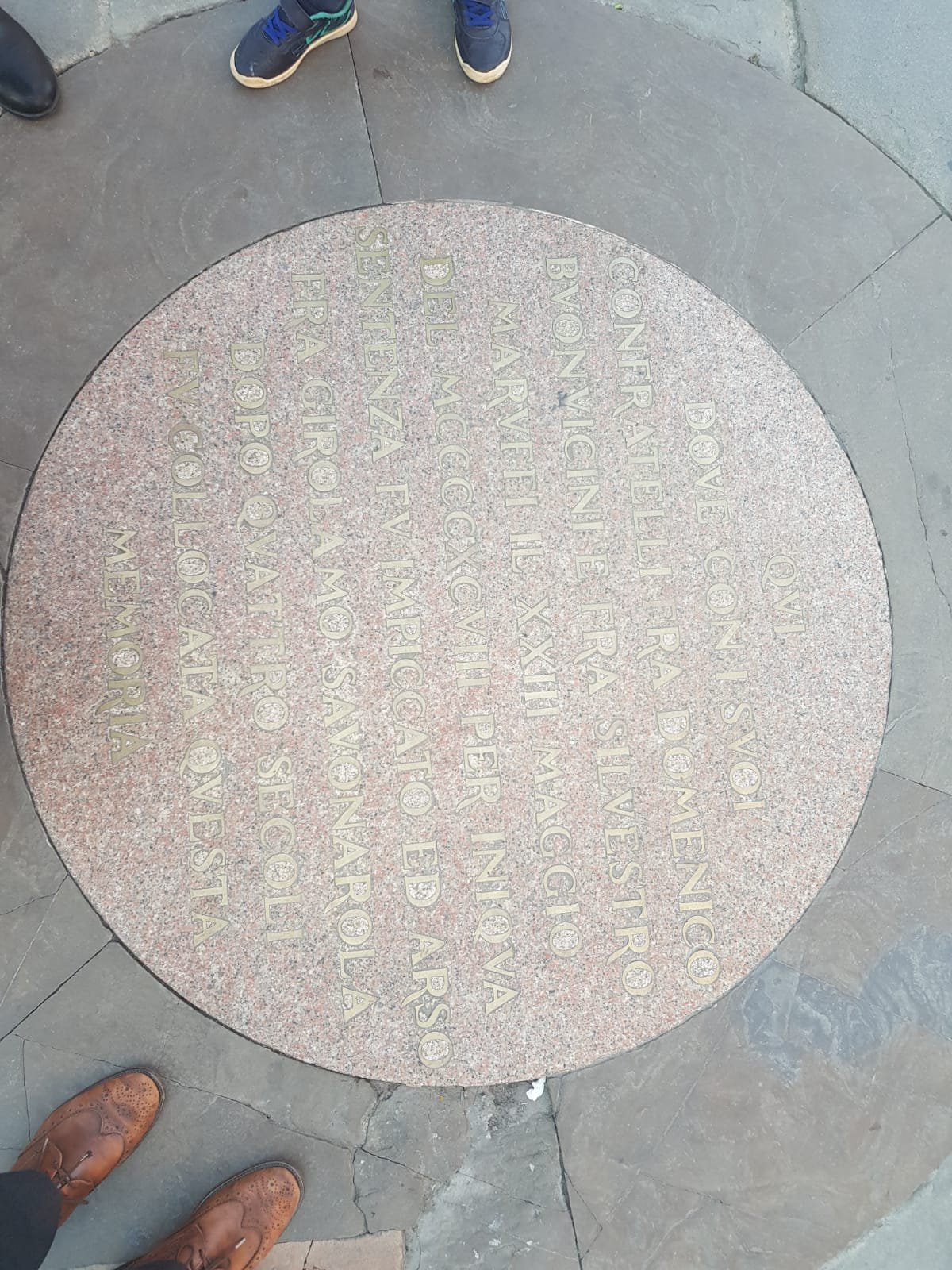 Am vrut să fac o poză. Și am reușit cu greu. De ce? Zeci de tineri și tinere cu părinții lor cu tot, puneau picioarele pe placa memorială, unde se pozau probabil pentru a încărca pe Instagram. Am fost curios de acest gest. Și întrebând, am aflat răspunsul halucinant. Condamnat fiind la moarte la 23 mai 1498, fiind ars pe rug în piața centrală, în fața palatului principal al familiei de’ Medici.